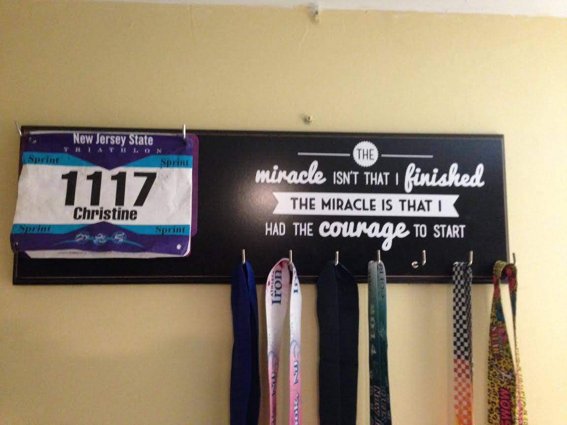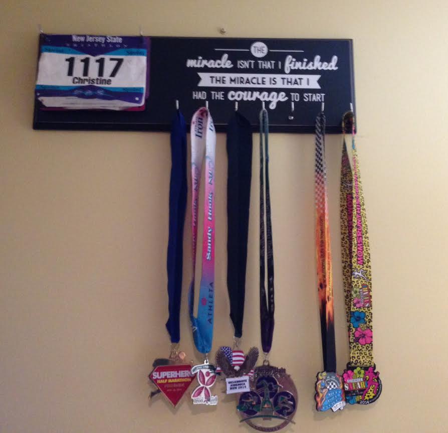 A while ago, I started wondering how to display my race bibs and medals. I had them hanging off of pictures in my computer area in the basement, but I wanted something a little more for them. I worked hard for them and I wanted to be inspired by being able to see them. After searching online, I discovered a whole host of ways to display my bling. Some more costly than others! I found something on Esty that was both with in my budget and perfect for where I wanted to put it.