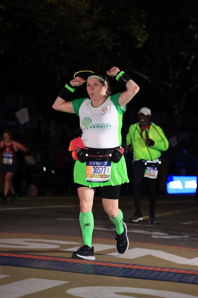 “There is something about having the grit and determination to get to the finish line while they are rolling up the carpets so to speak. When the crowds are sparse…… When the sun is setting…….. When it is dark in the park……. When you have to be your own cheerleader……. When you have to dig in deep to find your own grit and determination because you are the reason you are there in the first place and you will be the reason that you get to the finish line. There are no massive crowds to carry you to the finish line, but those that are there know how much that you need them. I was lucky to have a friend cheering on 5th Avenue. I almost missed her but she strained your voice to scream my name loud enough that I turned to see her………. It was perfect”