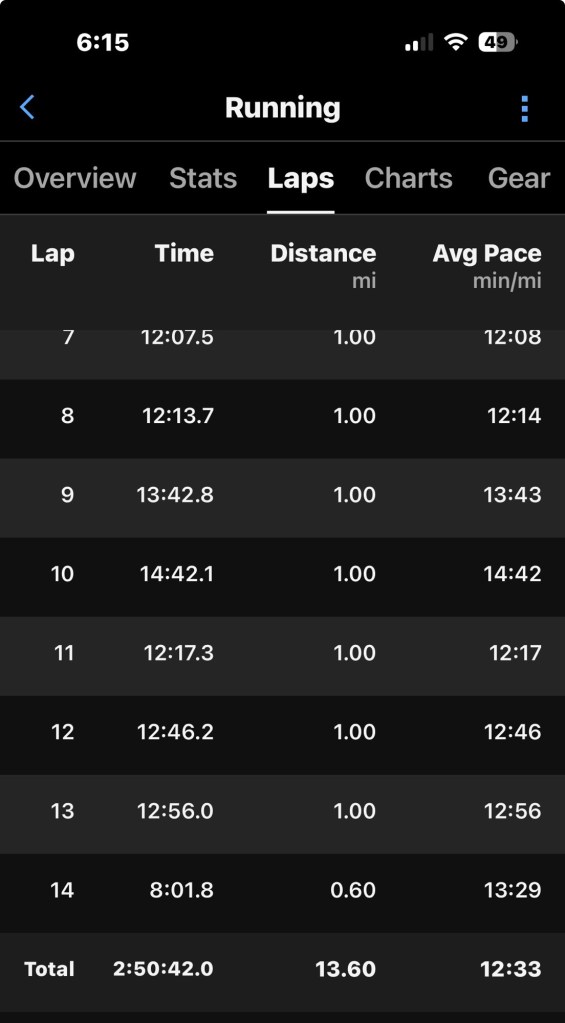 Then around mile 9 ish, my arms started to feel heavy. I was getting worried and while I hadn’t been adding calcium during training runs, I felt that I needed to add some. I have learned it is better to be overly cautious than to wait for harsher symptoms or a crash. And you can see mile 10 is what it was, but I did bounce back.